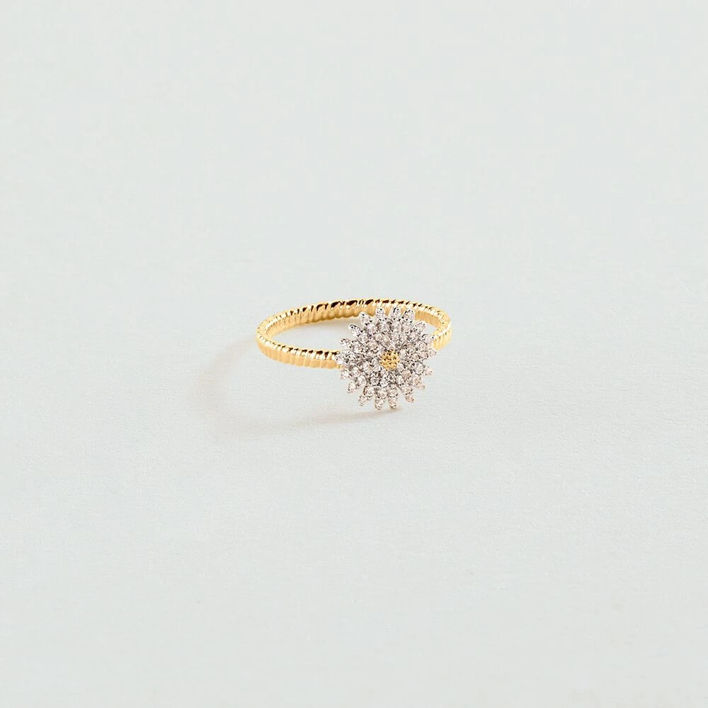 Bague en laiton doré à l’or 750/1000 montée d’un fleur printanière pavée d’oxydes de zirconium.