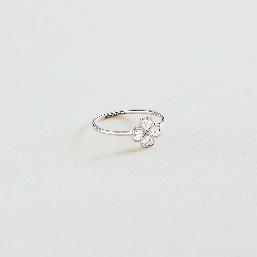 Bague en argent 925/1000 rhodiĂ© montĂ©e d’un trĂšfle au pĂ©tales d’oxydes de zirconium..