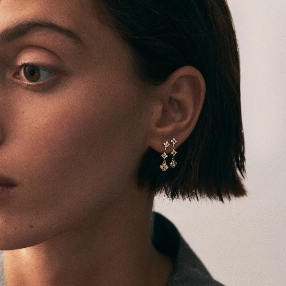 Boucles d’oreilles mi-longues, en argent véritable doré 750/1000, constituées d’un dégradé de 3 fleurs d’oxydes de zirconium et d’un fin graineti sur le pourtour.