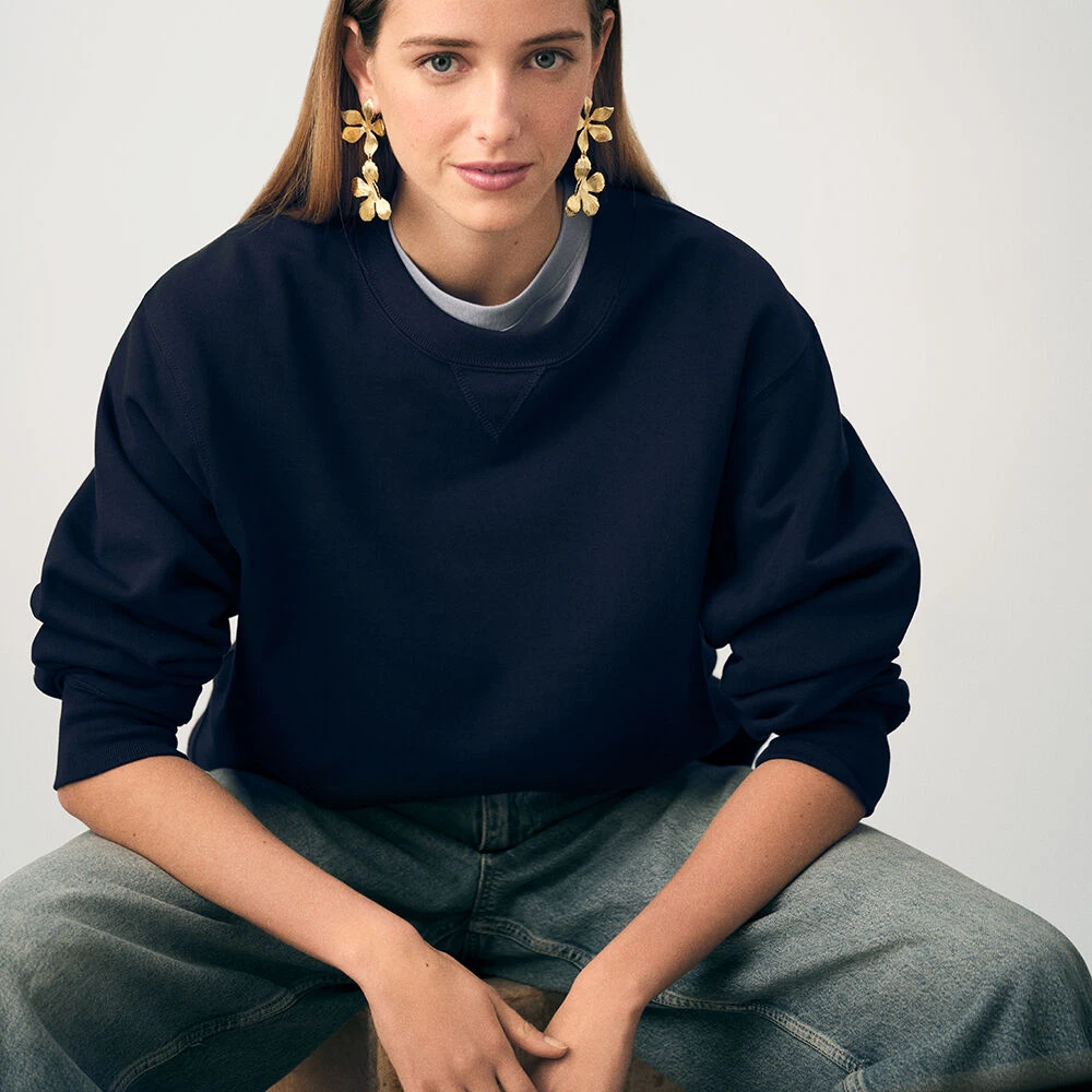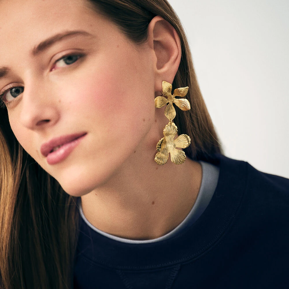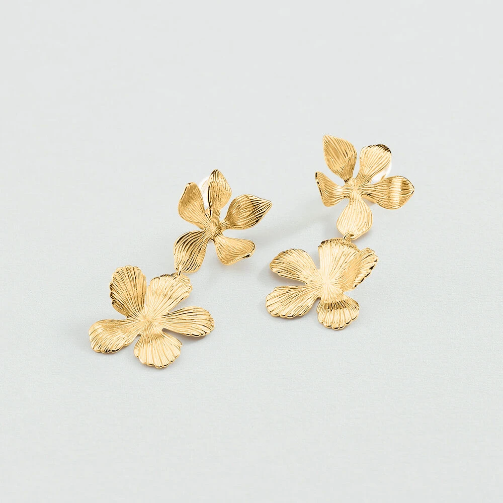 Boucles d’oreilles longues en laiton doré 750/1000 faites de deux fleurs.