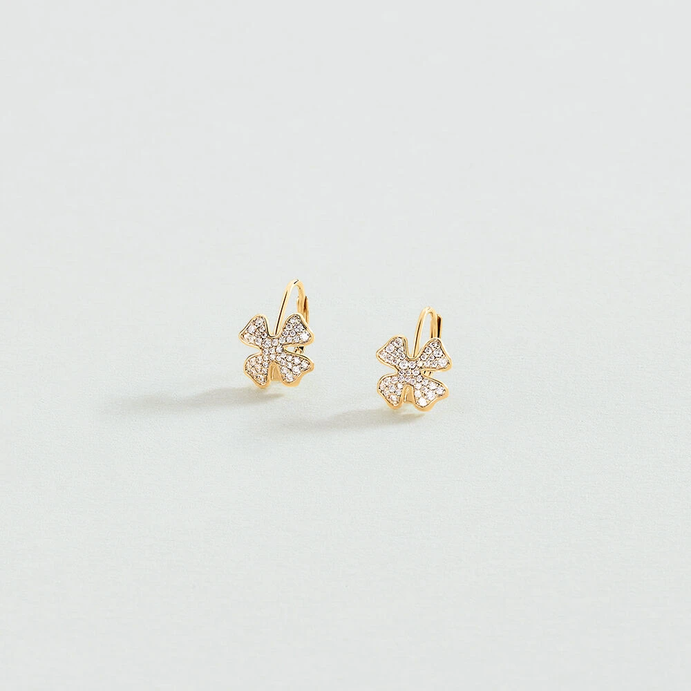 Boucles d’oreilles dormeuse en forme de trĂšfle en laiton dorĂ© Ă l’or 750/1000 et rhodiĂ© sous les oxydes de zirconium.