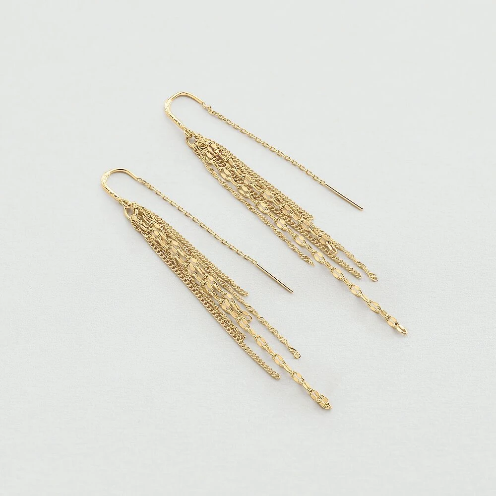 Boucles d’oreilles mi-longues, en laiton doré 750/1000, faites d’un pompom de 6 chaines de différentes longueurs .