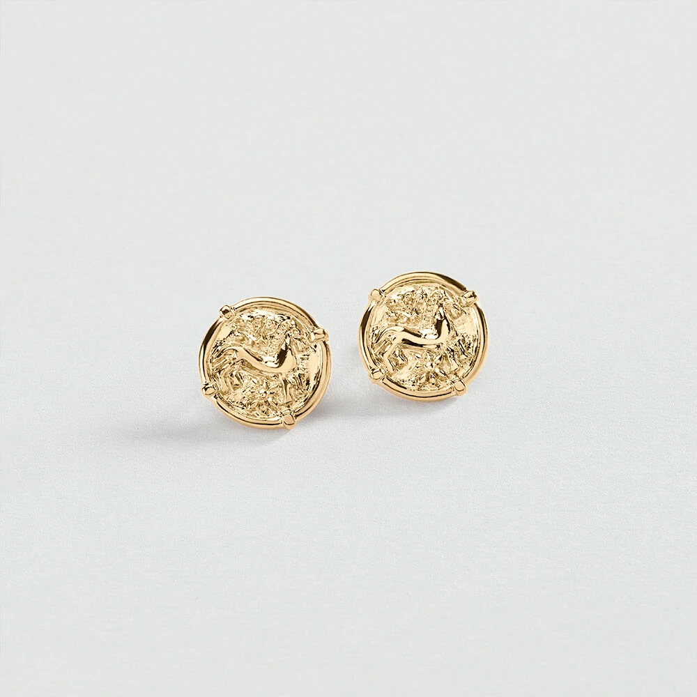 Boucles d’oreilles en métal doré à l’or fin plastron en forme de médaille symbolisant un cheval.