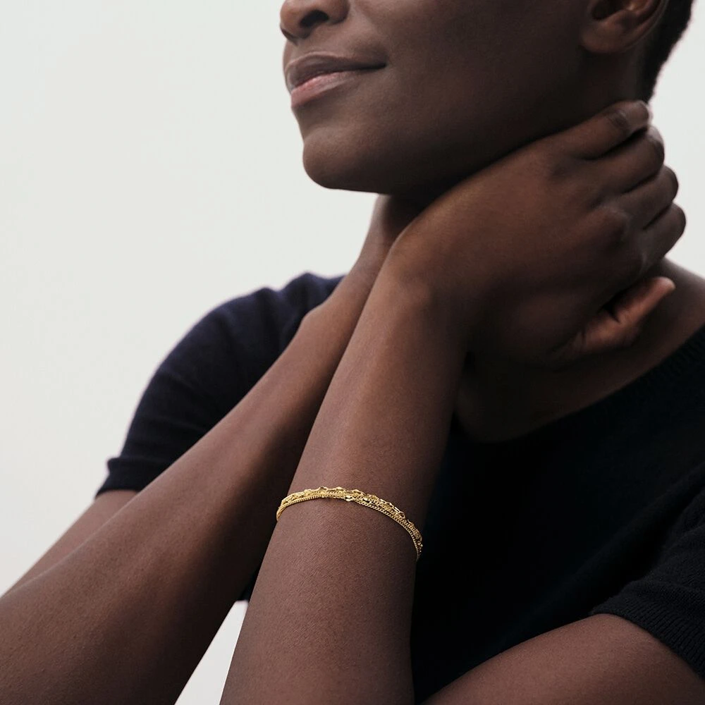 Bracelet, en laiton doré 750/1000, composé de 5 chaines fines. On signe ce bracelet avec un fermoir barrette, si identitaire à la marque et une médaille, en pampille, sur laquelle est gravé une citation positive sur la vie.