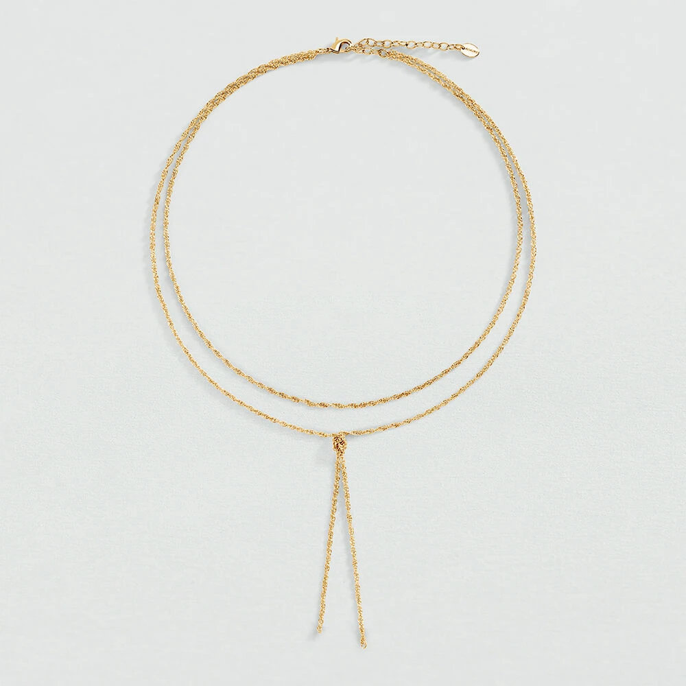 Collier cravate fait de plusieurs chaĂźnes en laiton dorĂ© Ă l’or fin.