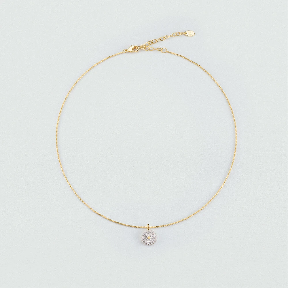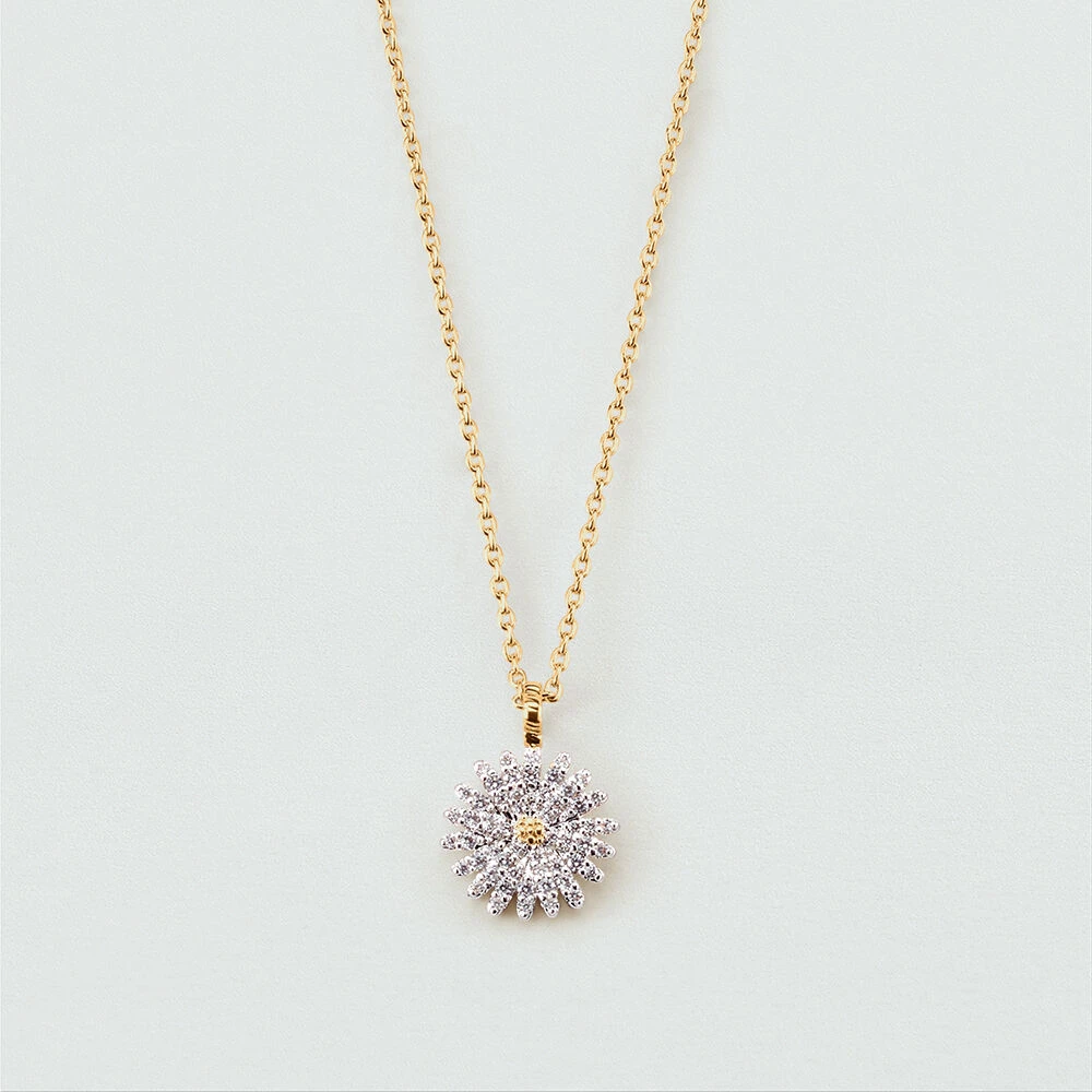 Collier court en laiton doré à l’or 750/1000. La fleur de ce collier est pavée d’oxydes de zirconium d’un côté et doré de l’autre afin de vous permettre de le porter d’un côté ou de l’autre ! . Ce bijou mesure 375mm et contient une rallonge de 50mm