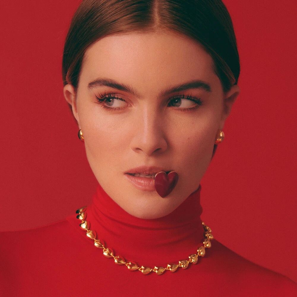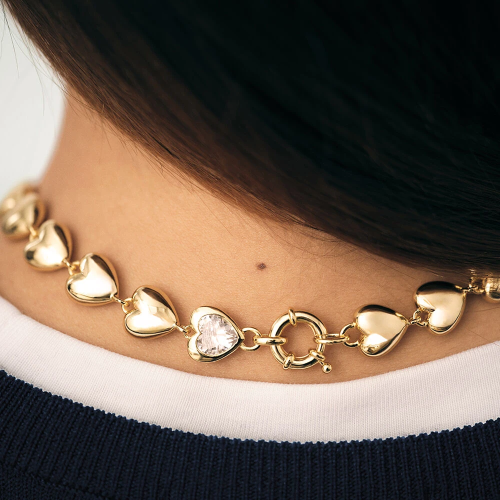 Collier en laiton dorĂ©, ornĂ© d’un rang de cĆurs en mĂ©tal et d’un cĆur en oxyde de zirconium scintillant.