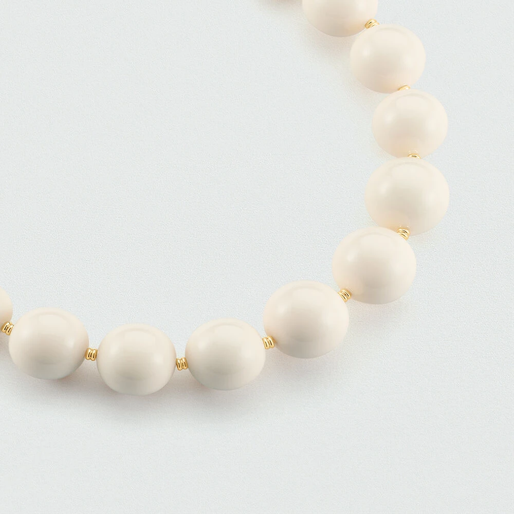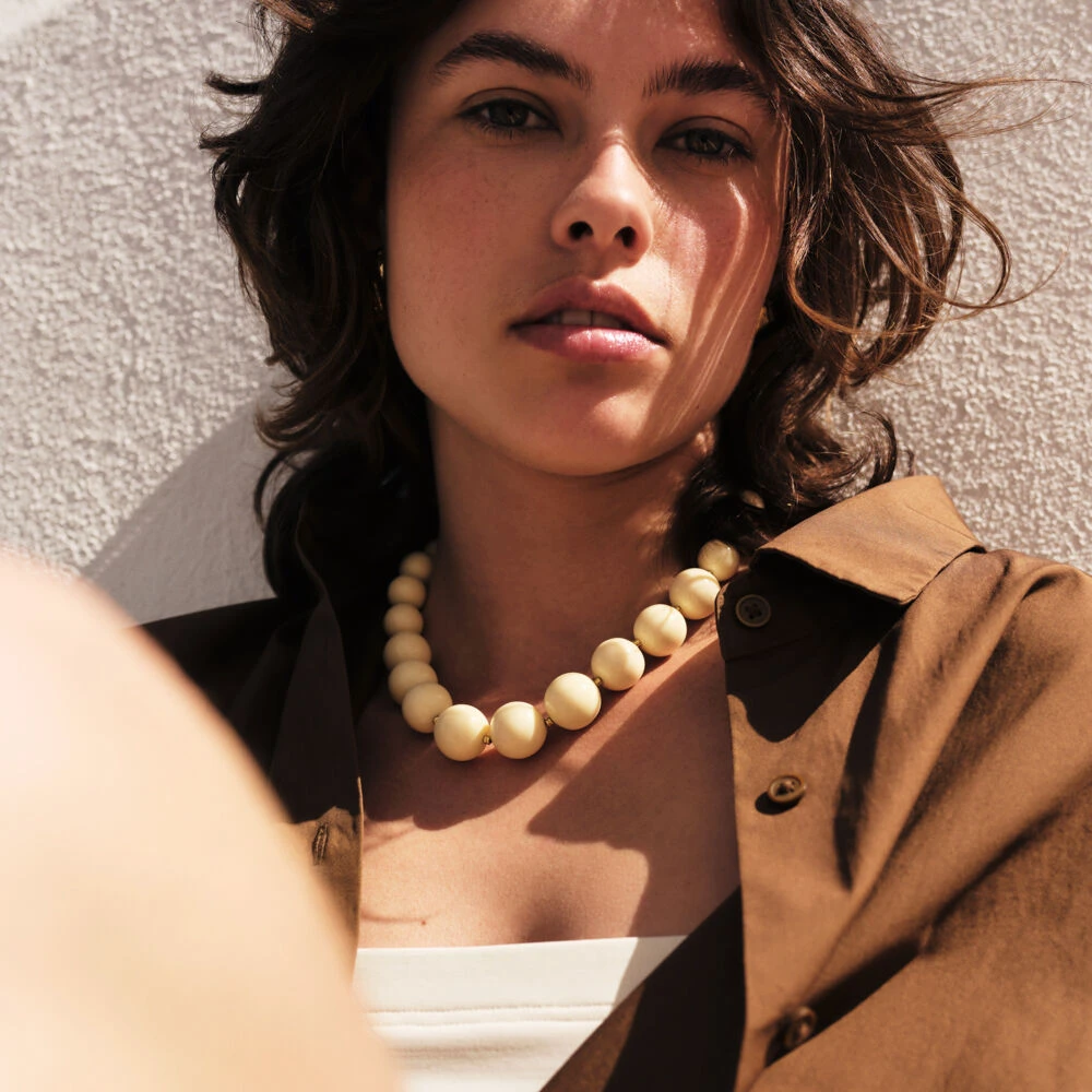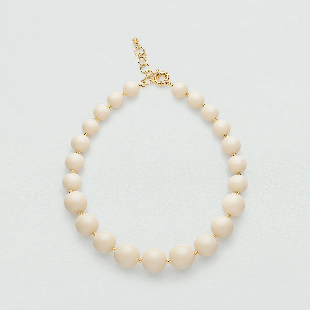 Collier en acétate et perle en laiton doré représentant une cascade de boule de couleurs.. Ce bijou mesure 420mm et contient une rallonge de 50mm