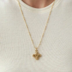 Pendentif charm en laiton doré à l’or 750/1000 en forme de croix munie de différentes pierres naturelles. Créez votre bijou unique et personnalisé en l’associant à d’autres pendentifs charms et à la chaîne de votre choix..