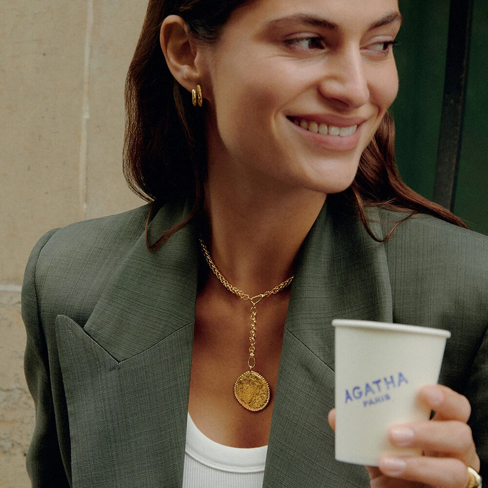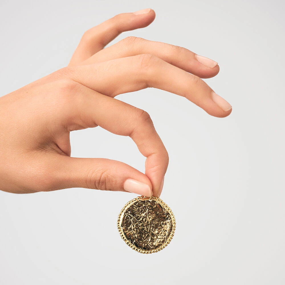 Médaille texturée modelée à la main en étain doré à l’or 750/1000. Créez votre bijou unique et personnalisé en l’associant à d’autres pendentifs charms et à la chaîne de votre choix.