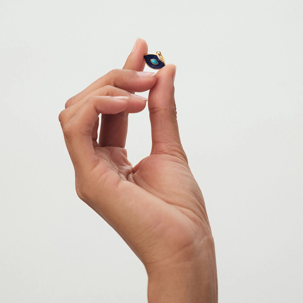 Pendentif charm en forme d’œil fait de Lapis Lazuli et d’Amazonite entouré de laiton doré à l’or 750/1000. Créez votre bijou unique et personnalisé en l’associant à d’autres pendentifs charms et à la chaîne de votre choix.