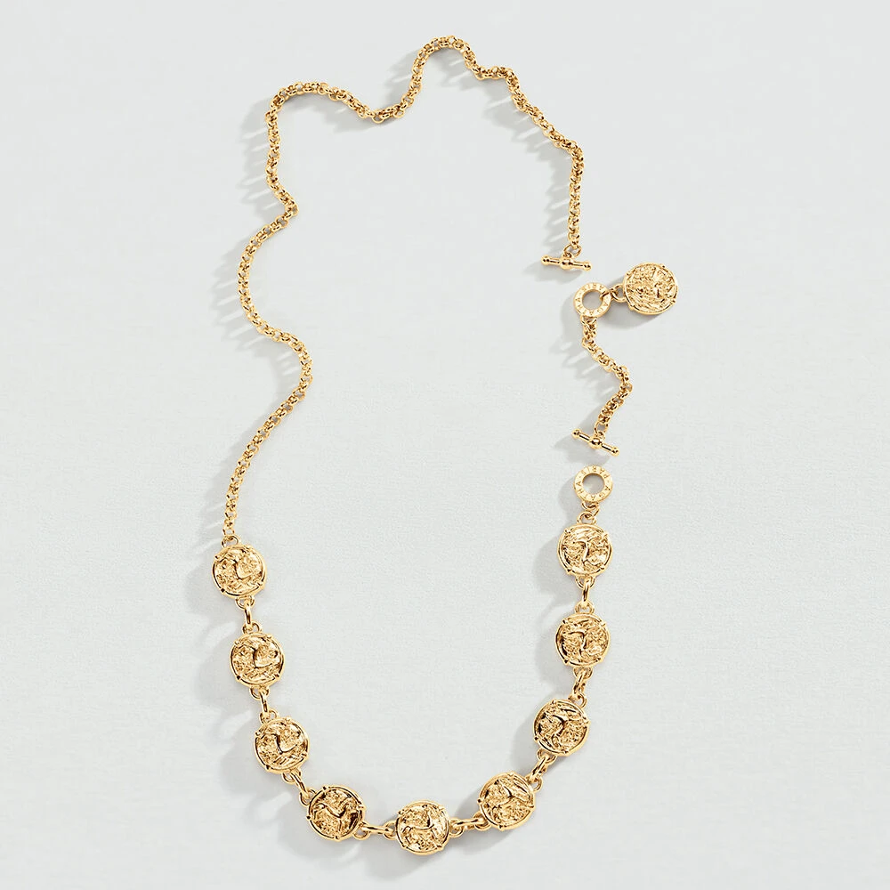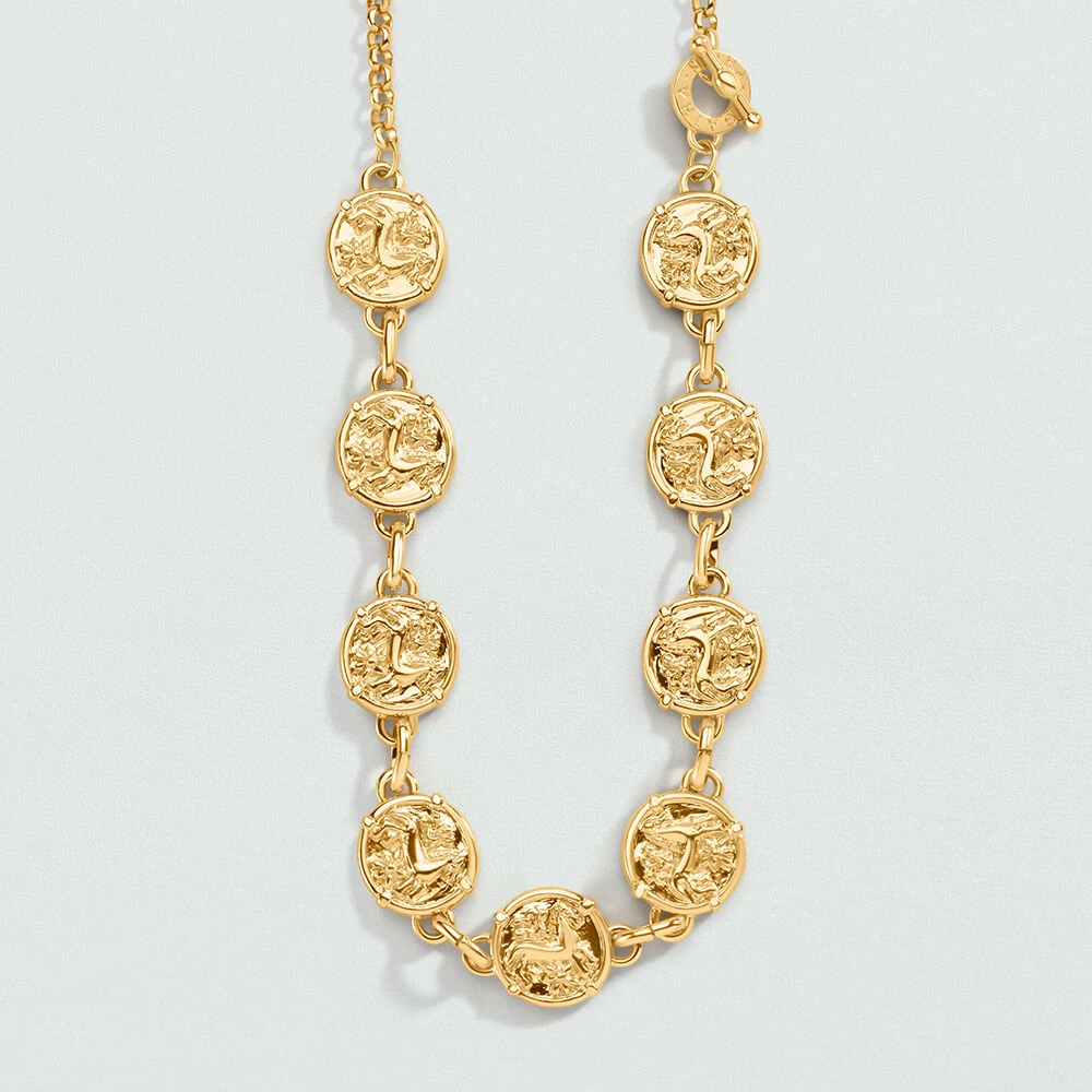 Ceinture en mĂ©tal dorĂ© Ă l’or fin avec des mĂ©dailles symbolisant un cheval.